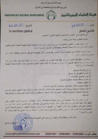 أصدرت هيئة العلماء الموريتانيين فتوى بإمكانية إقامة "صلاة الجمعة والجماعة" بشروط تأخذ في الحسبان المحافظة على الصحة.