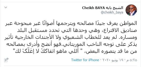 قال رئيس الجمعية الوطنية في موريتانيا الشيخ ولد باي، إن "صناديق الاقتراع هي وحدها التي تحدد مستقبل البلد ومساره".