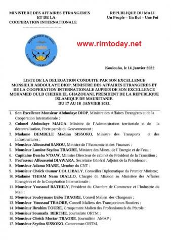 أعلنت رئاسة الجمهورية في مالي أن وفدا رفيعا يقوده وزير الشؤون الخارجية والتعاون الدولي عبد الله جوب، ويضم عدة وزراء ومسؤولين سامين آخرين تقرر إيفاده من رئيس المجلس العسكري الانتقالي العقيد أسيمي غويتا لدى رئيس الجمهورية