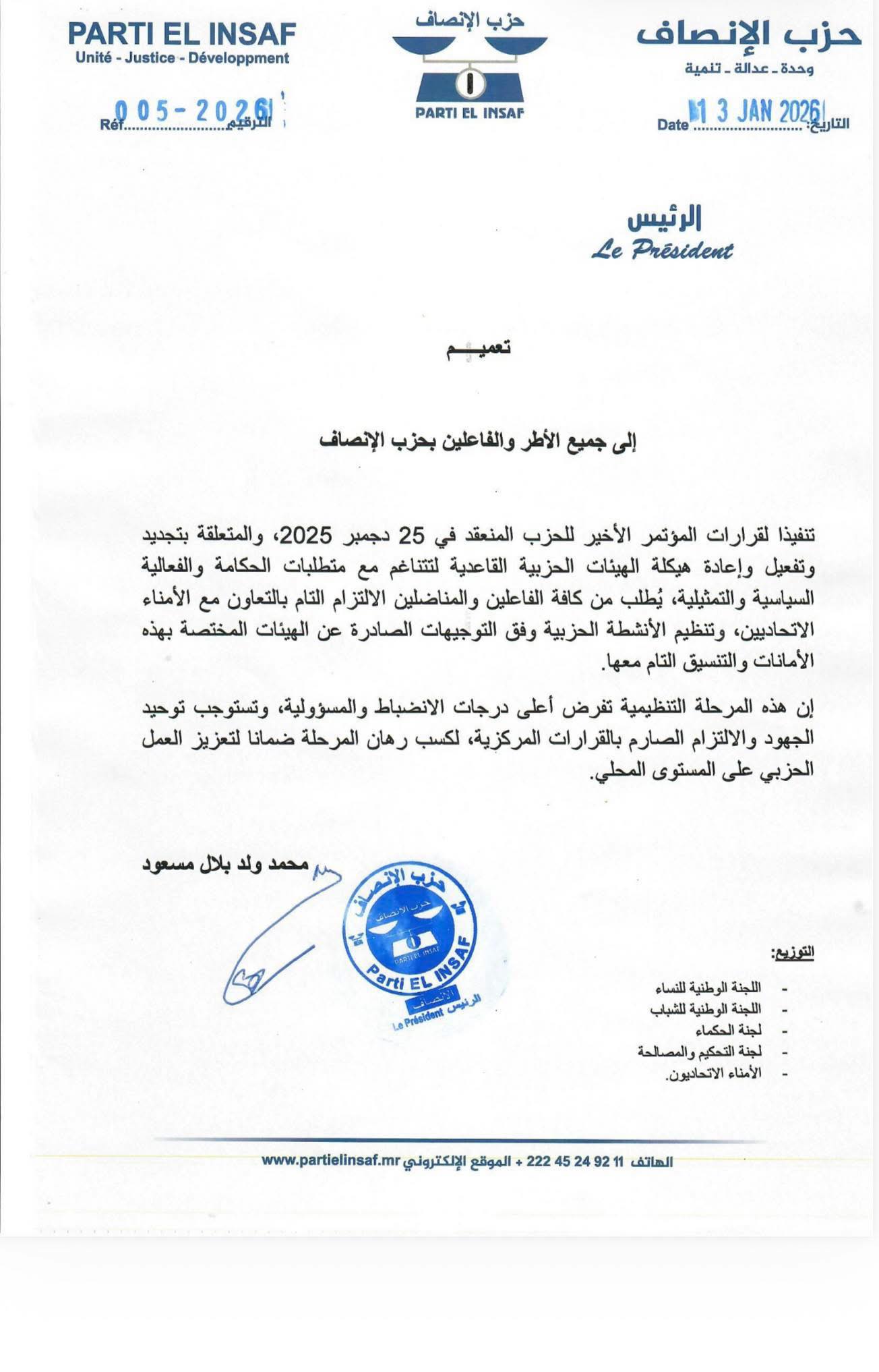 جاء في أول تعميم من رئيس حزب الإنصاف الجديد محمد ولد بلال مايلي: إلى جميع الأطر والفاعلين بحزب الإنصاف