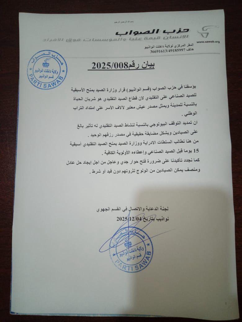 أعرب حزب الصواب في نواذيبو عن أسفه الشديد لقرار وزارة الصيد القاضي بوقف أنشطة الصيد التقليدي على مستوى الولاية، مؤكدا أن القرار يمسّ بشكل مباشر حياة آلاف العاملين في هذا القطاع الحيوي.