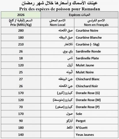 نشرت وزارة الصيد والاقتصاد البحري، عبر صفحة مرتبطة بنشاطها الرسمي، لائحة أسعار عينات الأسماك المعتمدة في إطار عملية تموين الأسواق خلال شهر رمضان لسنة 2026، وذلك بهدف ضمان توفر المنتجات البحرية بأسعار مناسبة للمواطنين.