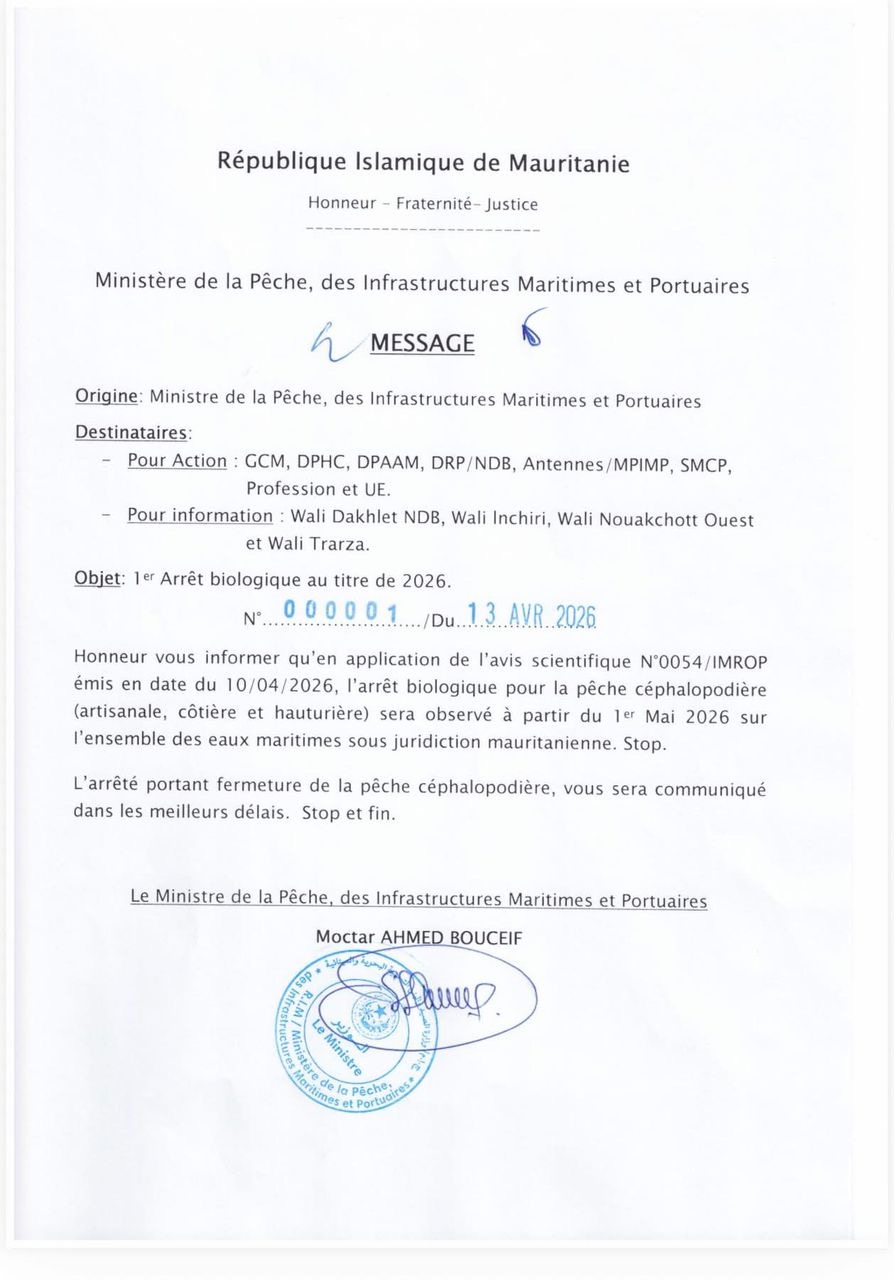 أعلنت وزارة الصيد والاقتصاد البحري، موعد التوقف البيولوجي لصيد رأسيات الأرجل ابتداء من فتح مايو المقبل، وذلك في جميع المياه البحرية الخاضعة للسيادة الوطنية.