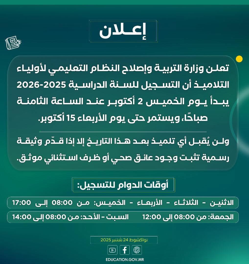 اعلنت وزارة التربية وإصلاح النظام التعليمي ان التسجيل للسنة الدراسية 2025-2026 يبدأ يوم الخميس 2 أكتوبر عند الساعة الثامنة صباحًا، ويستمر حتى يوم الأربعاء 15 أكتوبر.