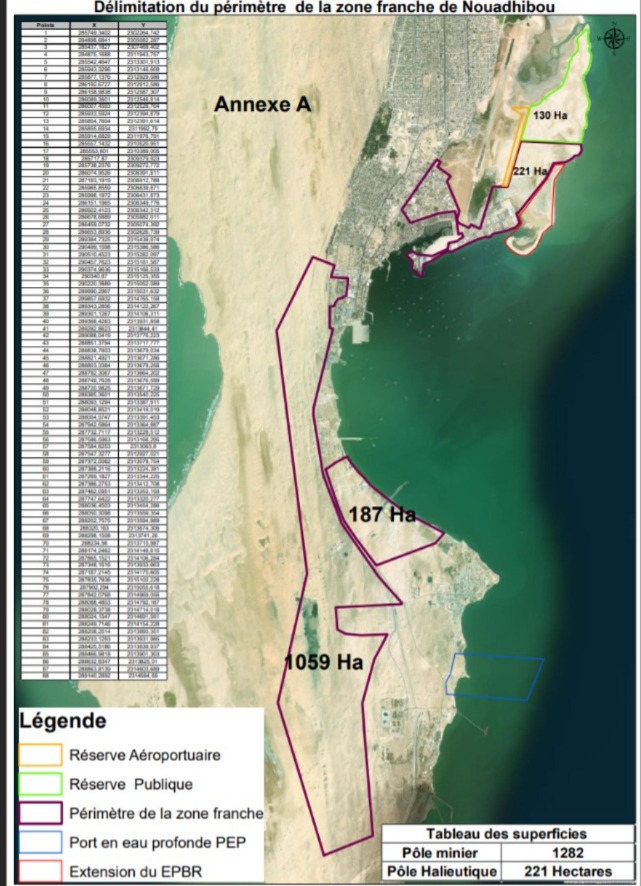 وكشف المرسوم المنظم لحدود المنطقة الحرة بنواذيبو أنها تتشكل من قطبين، أحدهما قطب للمعادن، وتبلغ مساحته 1282 مترا مربعا، والثاني قطب للصيد، وتبلغ مساحته 221 هكتارا.